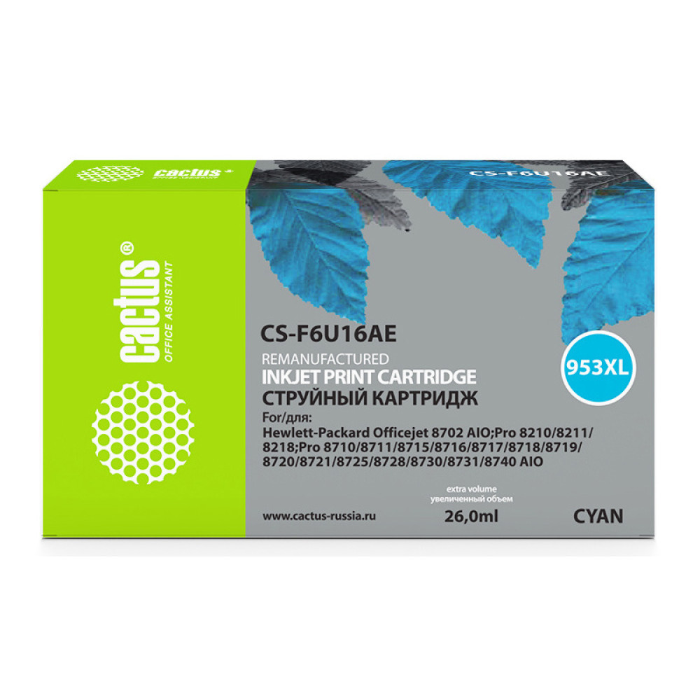 -/ Картридж струйный Cactus CS-F6U16AE 953XL голубой (26мл) для HP OJ Pro 7740/8210/8218/8710/8715