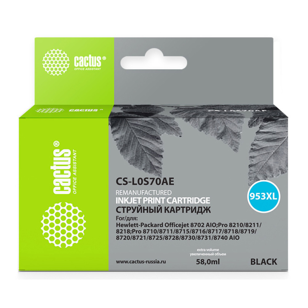 -/ Картридж струйный Cactus CS-L0S70AE №953XL черный (58мл) для HP OJ Pro 7740/8210/8218/8710/8715