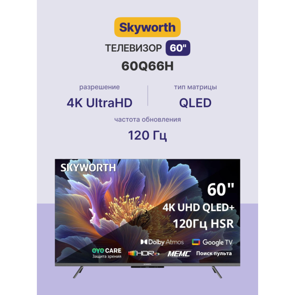 60", Ultra HD, QLED, 300Nit, Google TV, DVB-T2/C/S2, 2.0 ch Sound 10W*2 Dolby Atmos, 120Hz, 3 HDMI, 2 USB, Digital Audio Output, LAN, Composite output, CI, Выход для наушников, 2 Pole, 2025