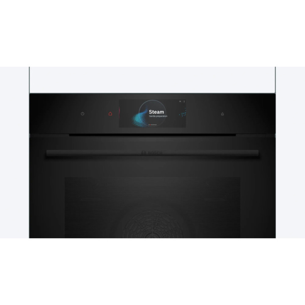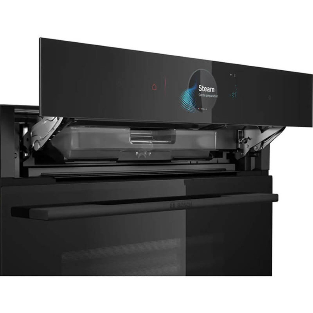 Accent Line. Serie 8, духовой шкаф-пароварка,черный, 24 режима,функция приготовление на пару 100%, 4-слойное остекление, 3 цветных текстовых TFT-дисплея 2,5" с сенсорным управлением, ControlRing, функции HomeConnect, трехстороннее LED-освещение,самоочистк