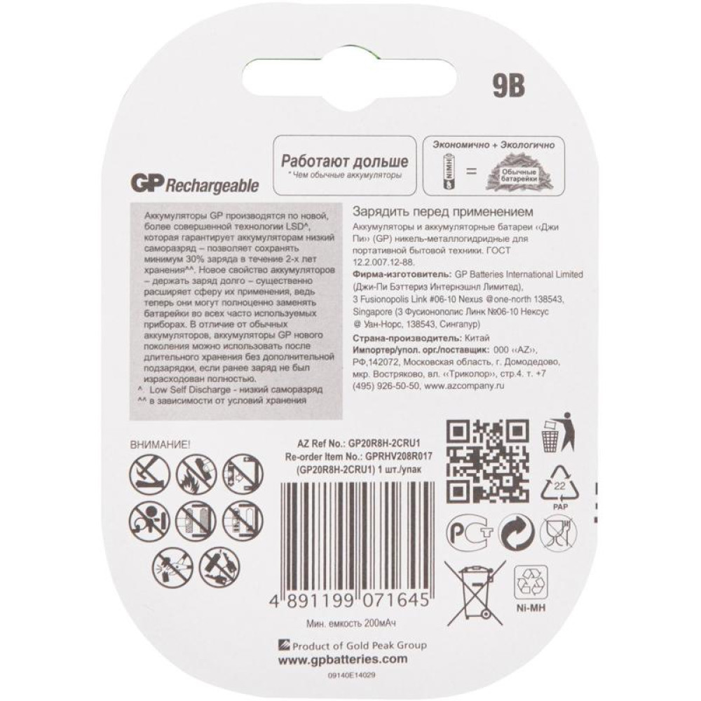 Аккумулятор GP 20R8H 9V NiMH 200mAh (1шт)