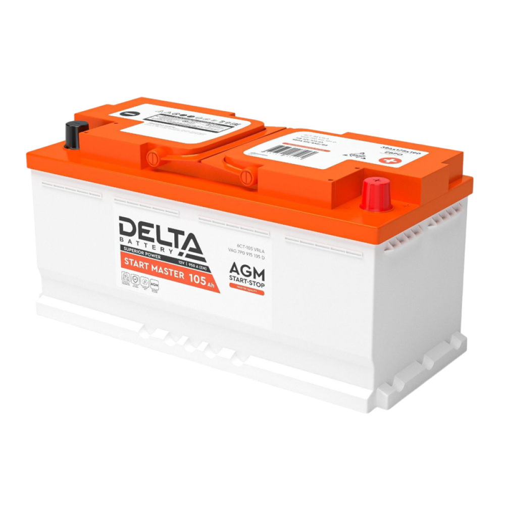 Аккумуляторная батарея для автомобилей/ DELTA серия START MASTER, DELTA START MASTER 105 Ah AGM, напряжение 12В, емкость 105 Ач (разряд 20 часов; 10.5В), пусковой ток: 950А, полярность обратная ( - +), тип AGM;Pb (свинцово-кислотный), клеммы: Euro 1, Д