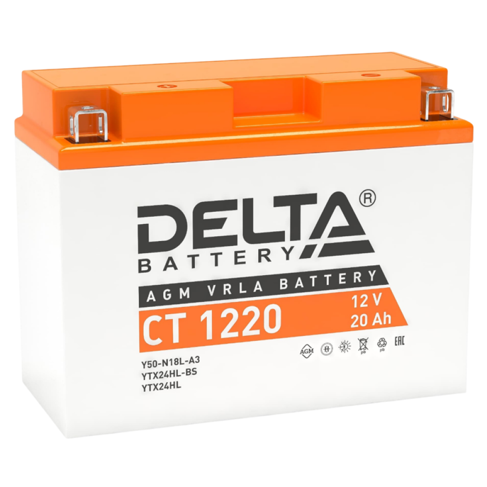 Аккумуляторная батарея для мото-техники/ DELTA серия CT, CT 1220, напряжение 12В, емкость 20 Ач (разряд 10 часов 10.5 В), пусковой ток: 250А, полярность обратная ( - +), тип AGM;Pb (свинцово-кислотный), клеммы: BN под болт, ДxШxВ 204x91x159мм., вес 6,