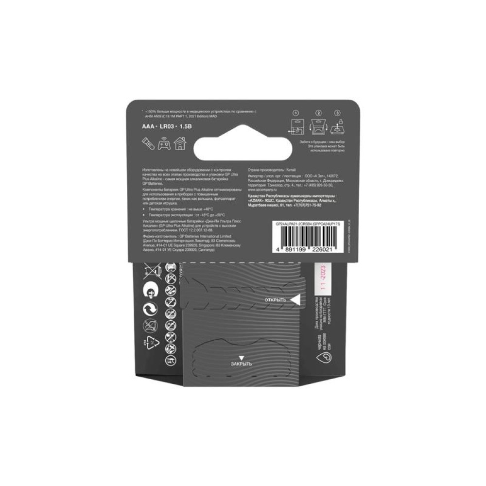 Батарея GP Ultra Plus Alkaline 24AUPA21-2CRSB4 AAA (4шт) блистер