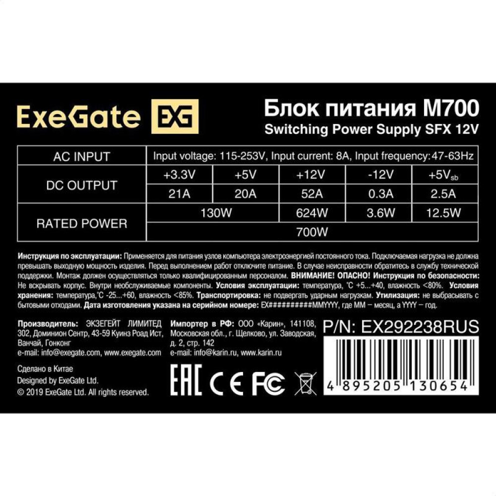 Блок питания 700W ExeGate M700 (SFX, APFC, КПД 87% (80 PLUS Silver), 8cm fan, 24pin, (4+4)pin, 2xPCI-E, 3xSATA, 2xIDE, black)