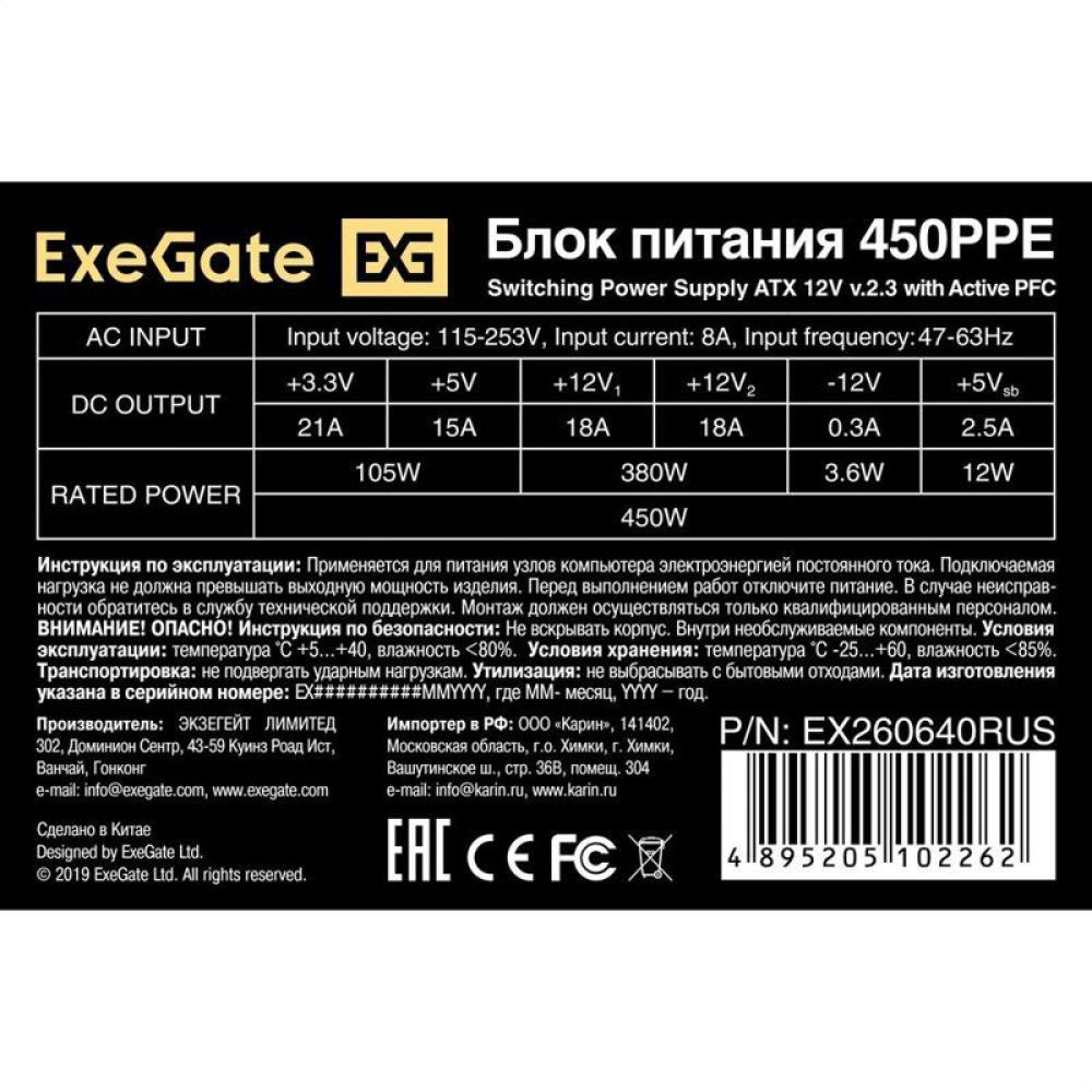 Блок питания Exegate БП 450W ExeGate 450PPE ATX, APFC, PC, 12cm fan, 24p, (4+4)p, PCIe, 5SATA, 3IDE, FDD, black OEM {10} (102262)