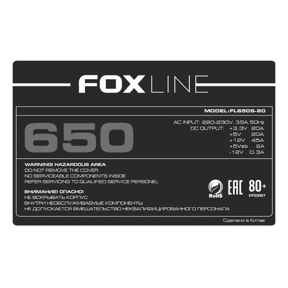 Блок питания Foxline FL650S-80 550W 80+ ATX PSU, APFC, 120FAN, 24 pin, 4 + 4 Pin (12V), 5*SATA, 2*4 pin molex, 1*FDD, 2*PCI-e(6 + 2 pin)