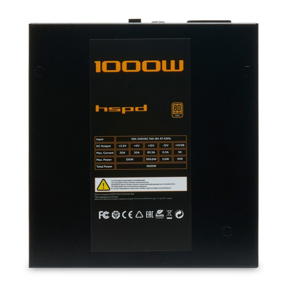 Блок питания/ Power Supply HSPD, 1000W 80+ Gold (ATX, 2.52, Full modular, 1x24(20+4)pin 600mm, 2xCPU 8(4+4)pin 700mm, 2xPCIe*2 8(6+2)pin 600+150mm, 2xSATA*3 500+150+150mm, 1xMOLEX*3 500+150+150mm , Active, 120x120mm, 150x140x86mm, APFC, OVP, OPP, SCP, UVP
