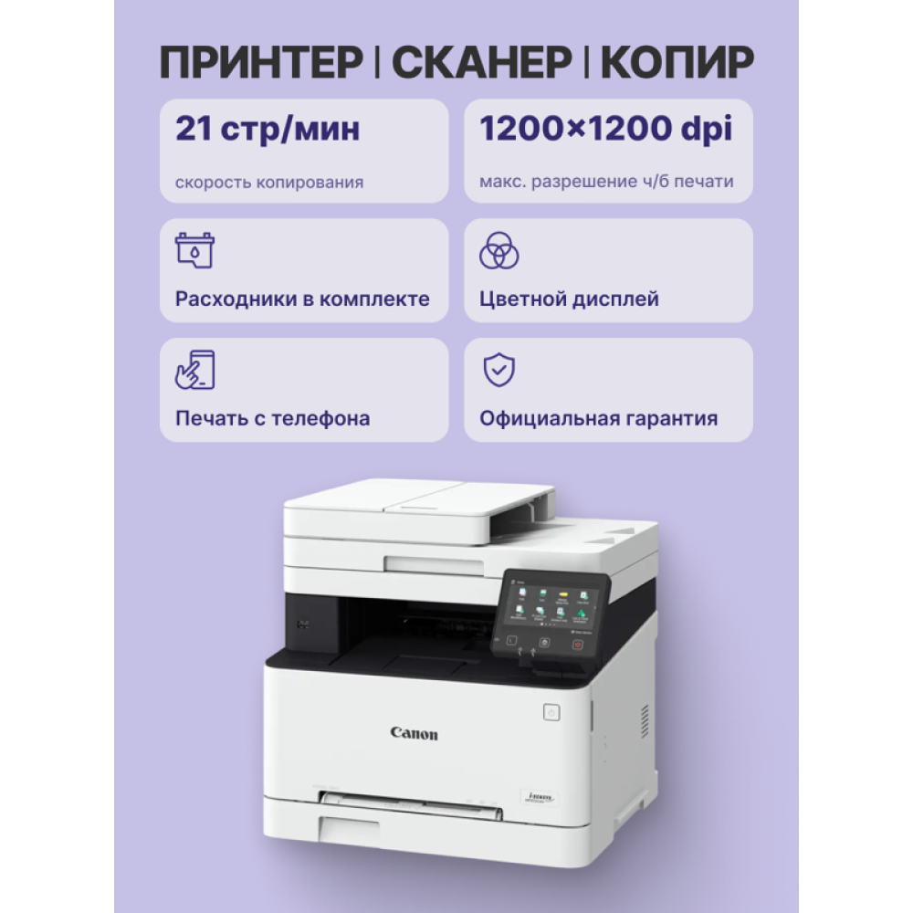 Повышайте эффективностьОцените быструю печать, высокоскоростное двустороннее сканирование за один проход и большой сенсорный экран для эффективного выполнения заданий печати и сканирования.