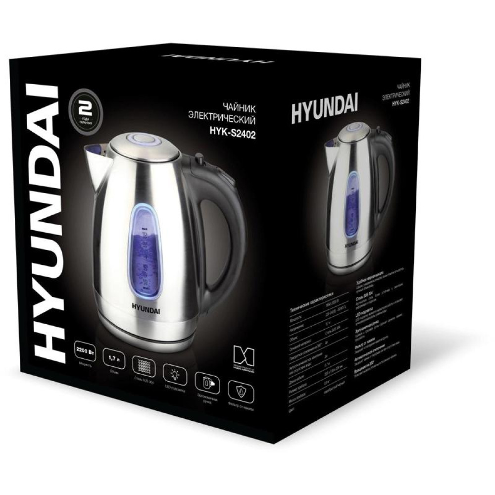 Чайник электрический Hyundai HYK-S2402 1.7л. 2200Вт серебристый матовый/черный корпус: металл