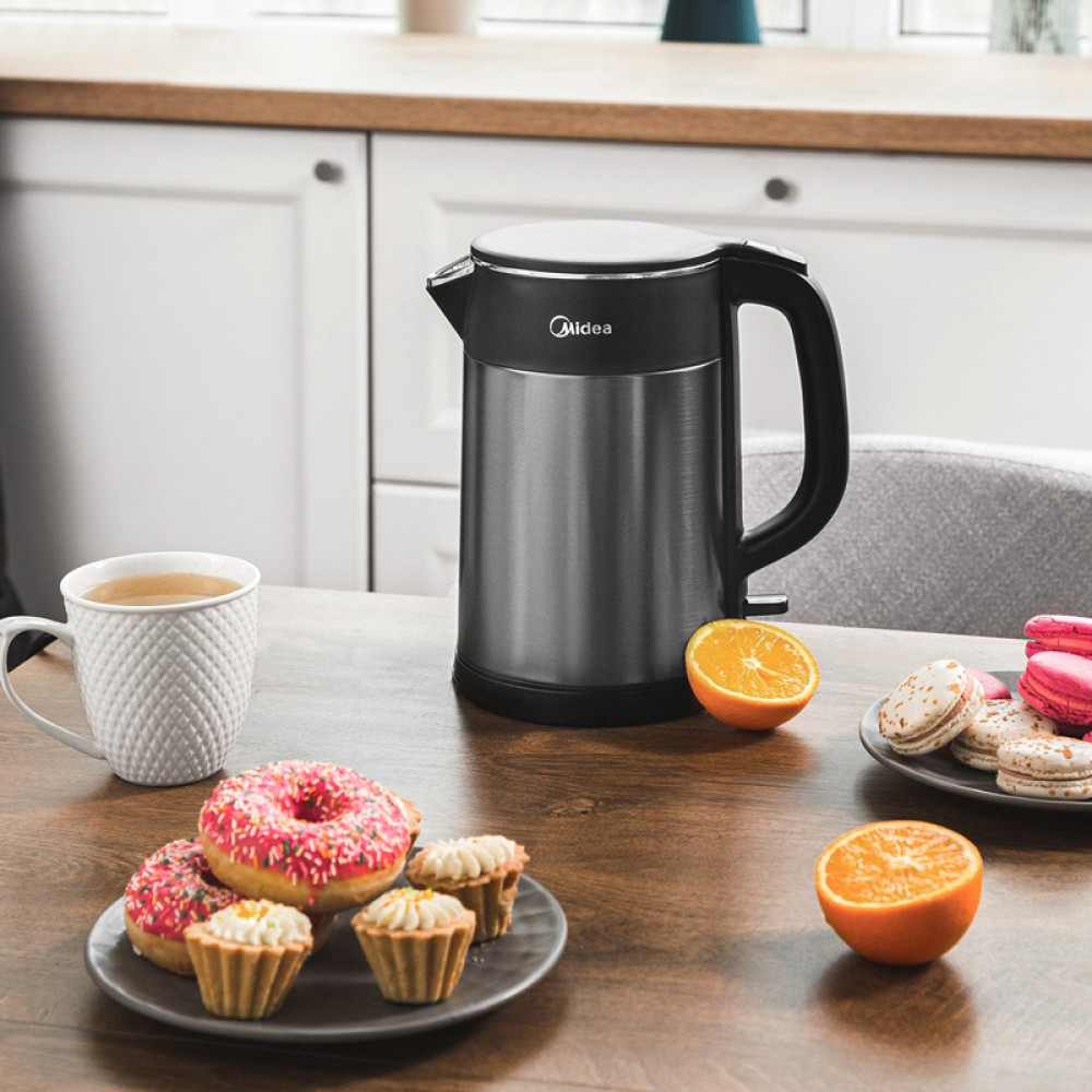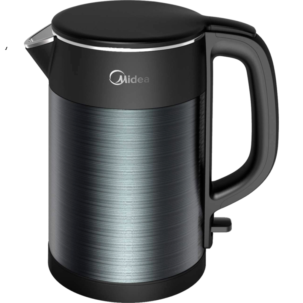 Чайник Midea MK-8076 - двойные стенки из нержавеющей стали, цельная колба, объем 1.5 л, мощность 2200 Вт, индикатор включения, сматываемый шнур, цвет корпуса черный.