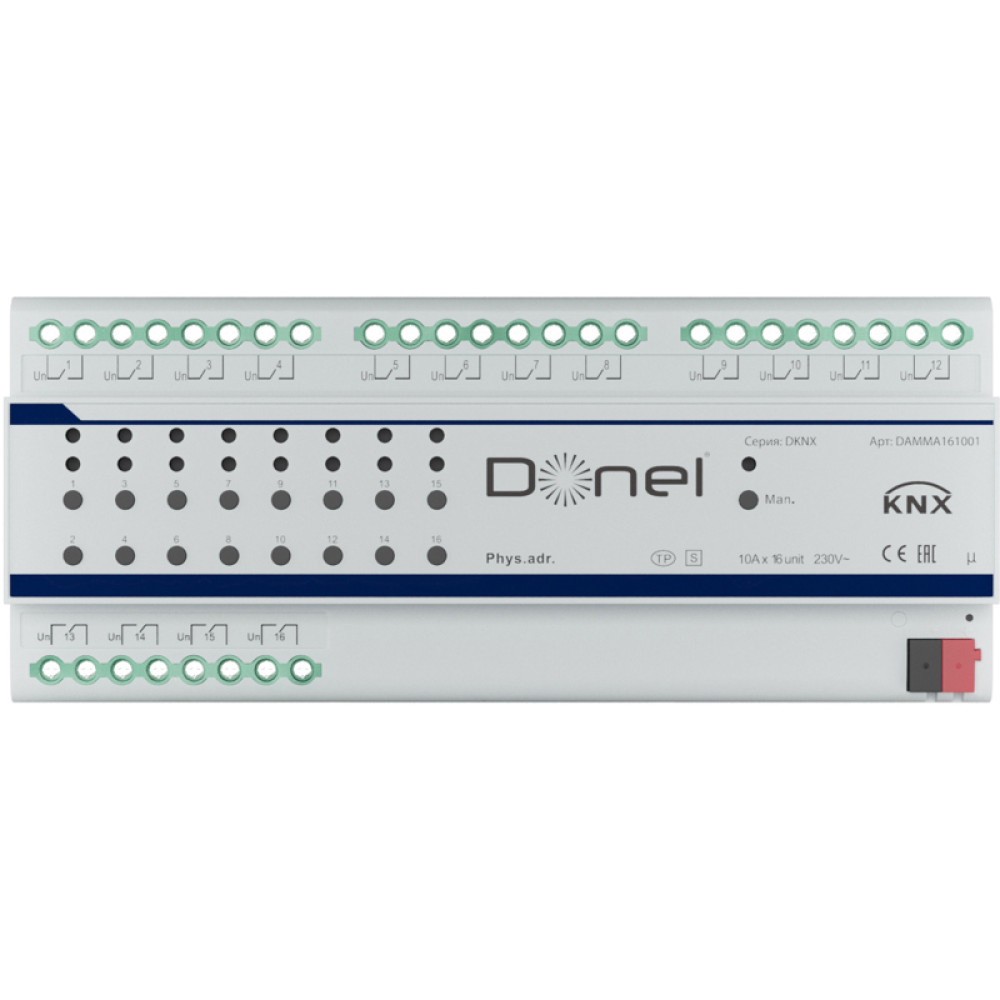 Donel KNX 16-канальный многофункциональный актуатор, 10A Установка на DIN-рейку, Номинальное напряжение 230/400 В переменного тока, 50–60 Гц, внутреннее использование магнитного реле 10 А, привод переключателя/жалюзи/фанкойла, Cерия DKNX