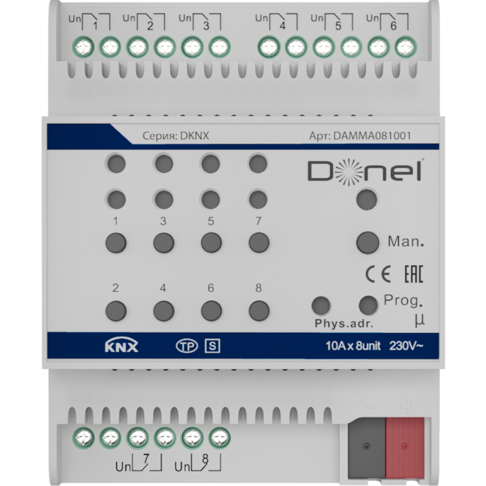 Donel KNX 8-канальный многофункциональный актуатор, 10A Установка на DIN-рейку, Номинальное напряжение 230/400 В переменного тока, 50–60 Гц, внутреннее использование магнитного реле 10 А, привод переключателя/жалюзи/фанкойла, Cерия DKNX