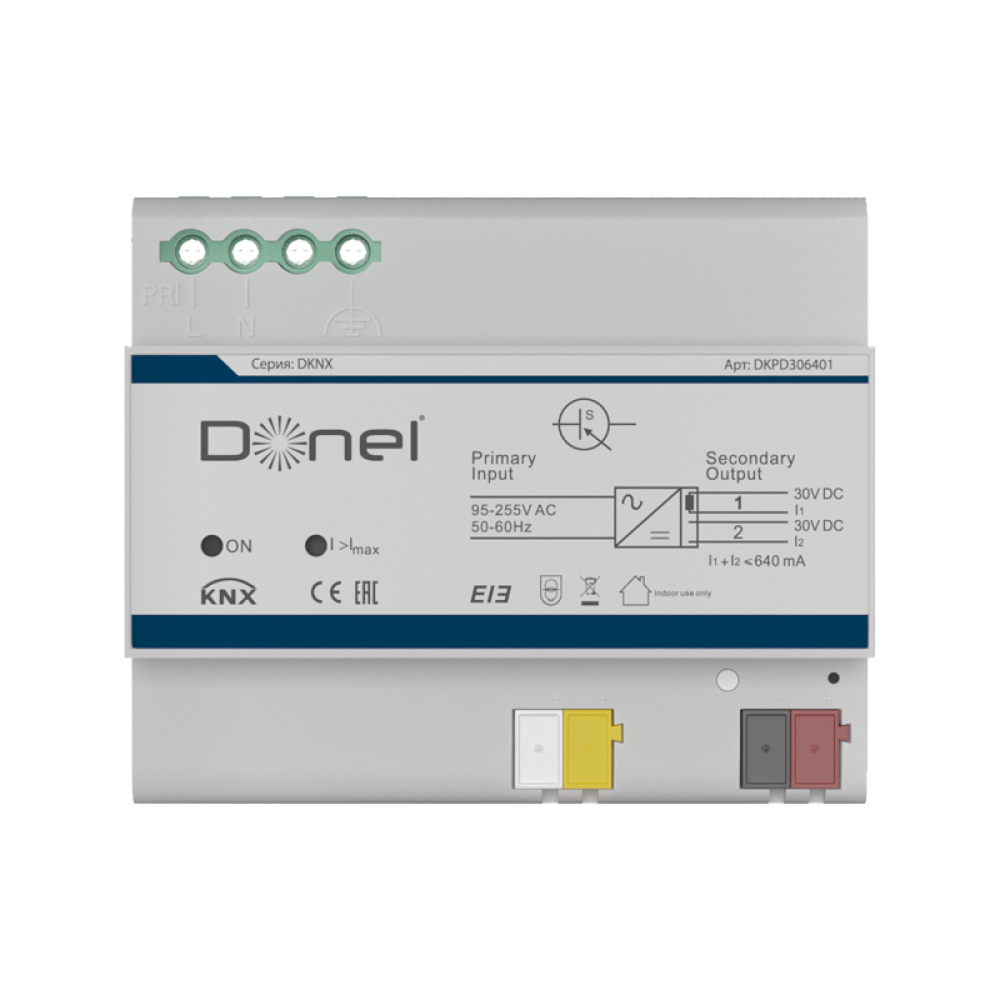 Donel KNX блок питания, 640 мA. Входное напряжение 95-255 В AC, 47-63 Гц, выход 1: 30 В DC +1/-2 В, SELV с дросселем; выход 2: 30 В DC +1/-2 В, SELV без дросселя, всего 640 мА, защита от короткого замыкания, Cерия DKNX