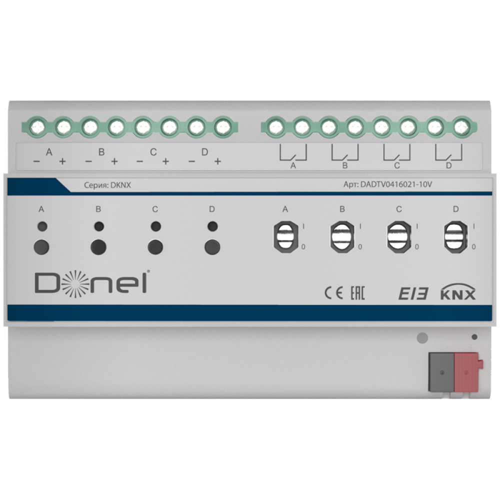 Donel KNX Диммер 1-10V , 4-канальный, 16A, Пассивный режим DC 0/1-10 В, ток переключения 16 А / 250 В переменного тока, Функции KNX: Swith, относительное и абсолютное диммирование, реакция на состояние, сцены (15/канал), предустановка. Установка на DIN-ре