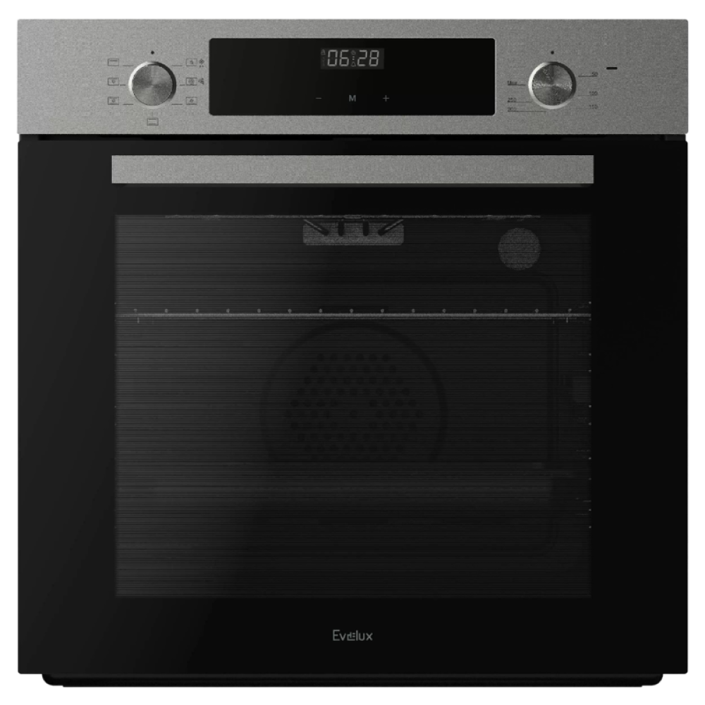 Электрический духовой шкаф EVELUX, Hi-Tech, 60 см, объем 72 л, поворотные переключатели, LED дисплей, таймер, защитное отключение, защита от детей, конвекция, 8 режимов, телескопические направляющие, 3 стекла в дверце, мкс температура 280 градусов, энерго