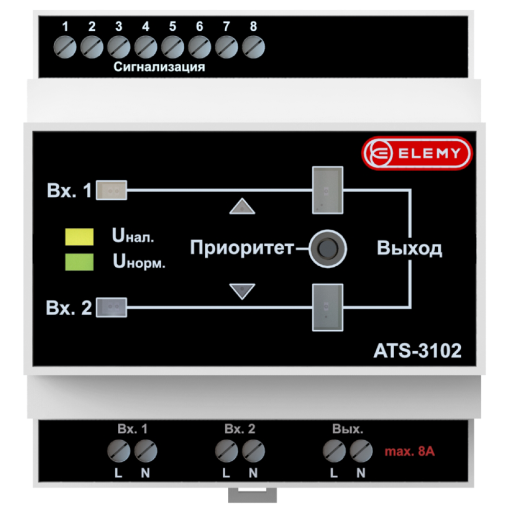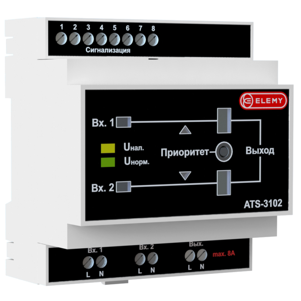 Исполнение: 5 DIN на монтажной рейкеПереключение между вводами происходит за 3-14 мсКонфигурация: 220V 8A 1700VAПодключение вводов и нагрузки через клеммные колодкиСигнализация состояний в виде сухих контактовФиксированные уставки переключения: при понижении напряжения ниже 180 В, при повышении напряжения выше 250 ВУстойчив к всплескам напряжений до 300VМнесхема и наглядная световая индикация