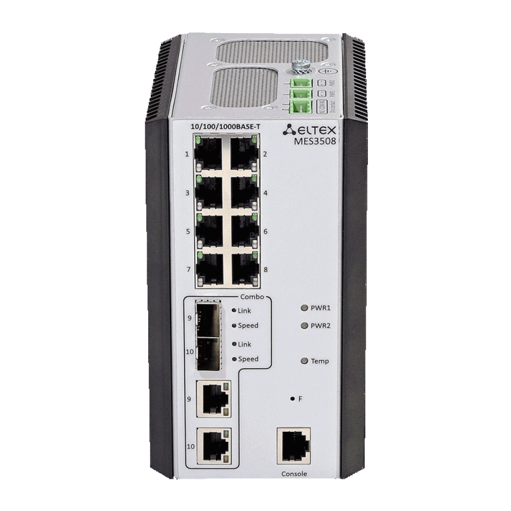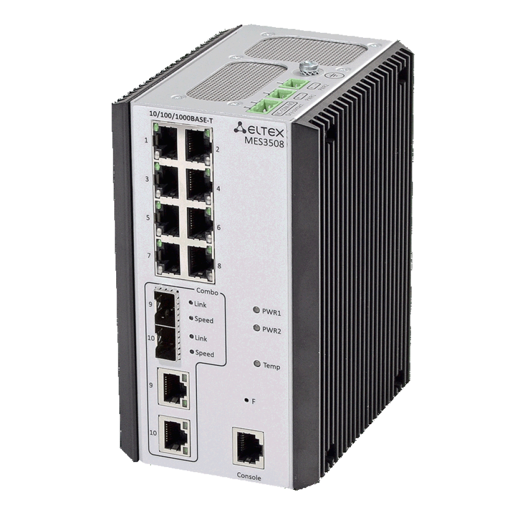 Коммутатор Eltex MES3508 предназначен для создания защищенных и отказоустойчивых сетей передачи данных на объектах, где важна высокая устойчивость к температурным, механическим и вибрационным воздействиям.