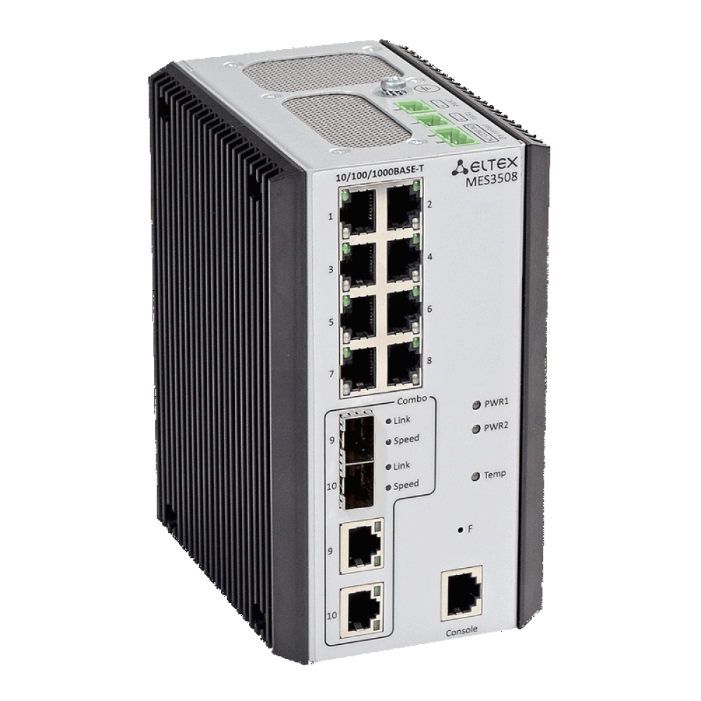 Коммутатор Eltex MES3508P предназначен для создания защищенных и отказоустойчивых сетей передачи данных на объектах, где важна высокая устойчивость к температурным, механическим и вибрационным воздействиям.