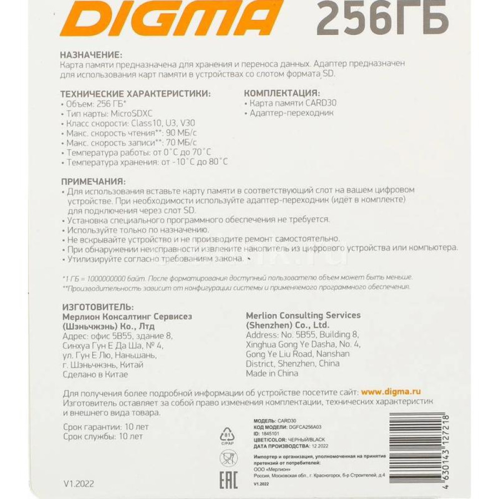 Флеш карта microSDXC 256GB Digma CARD30 V30 + adapter