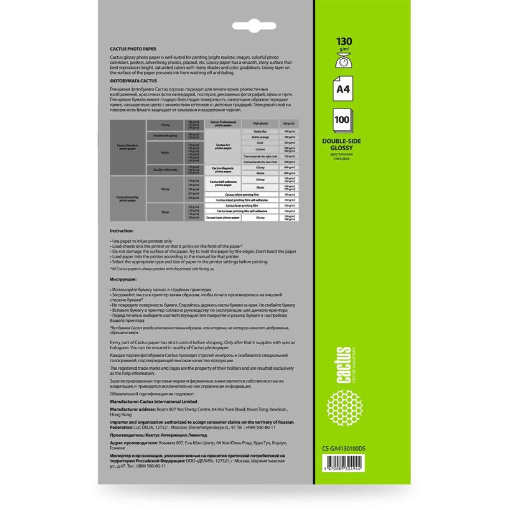 Фотобумага Cactus CS-GA4130100DS A4/130г/м2/100л./белый глянцевое/глянцевое для струйной печати