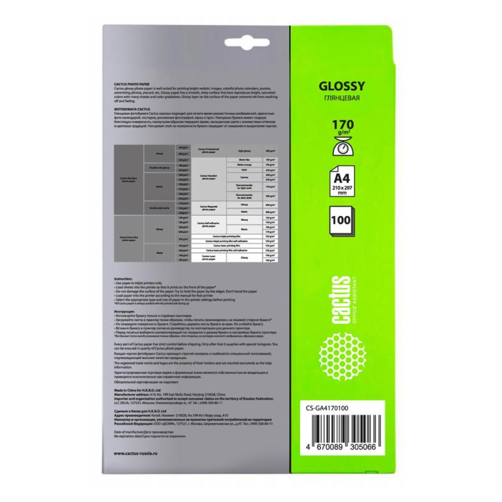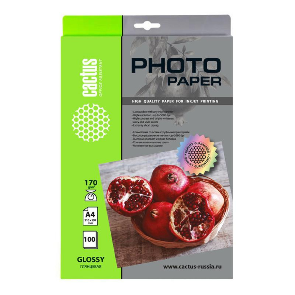 Фотобумага Cactus CS-GA4170100 A4/170г/м2/100л./белый глянцевое для струйной печати