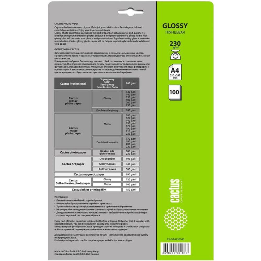 Фотобумага Cactus CS-GA4230100 A4/230г/м2/100л./белый глянцевое для струйной печати