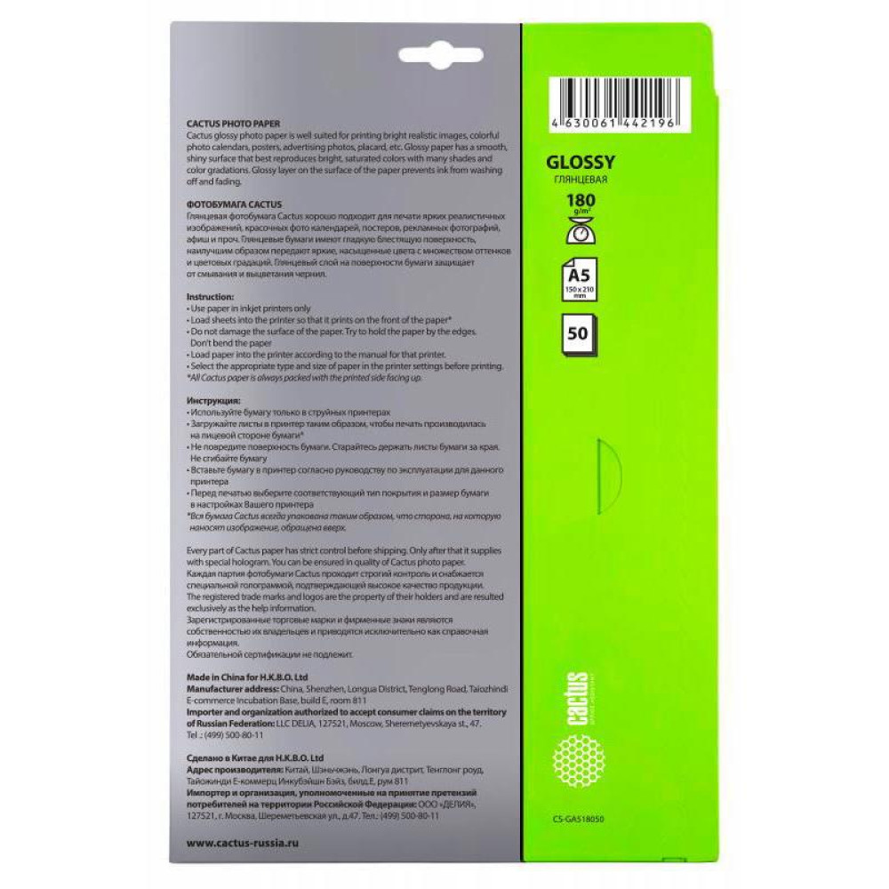 Фотобумага Cactus CS-GA518050 A5/180г/м2/50л./белый глянцевое для струйной печати