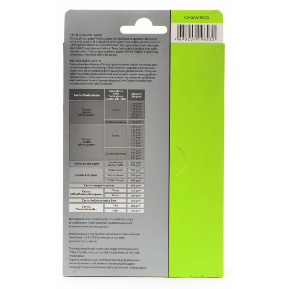 Фотобумага Cactus CS-GA618025 10x15/180г/м2/25л./белый глянцевое для струйной печати
