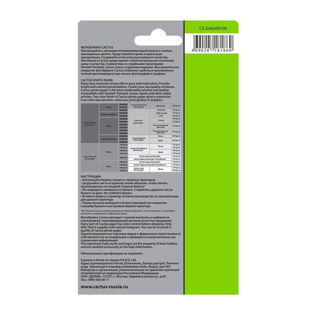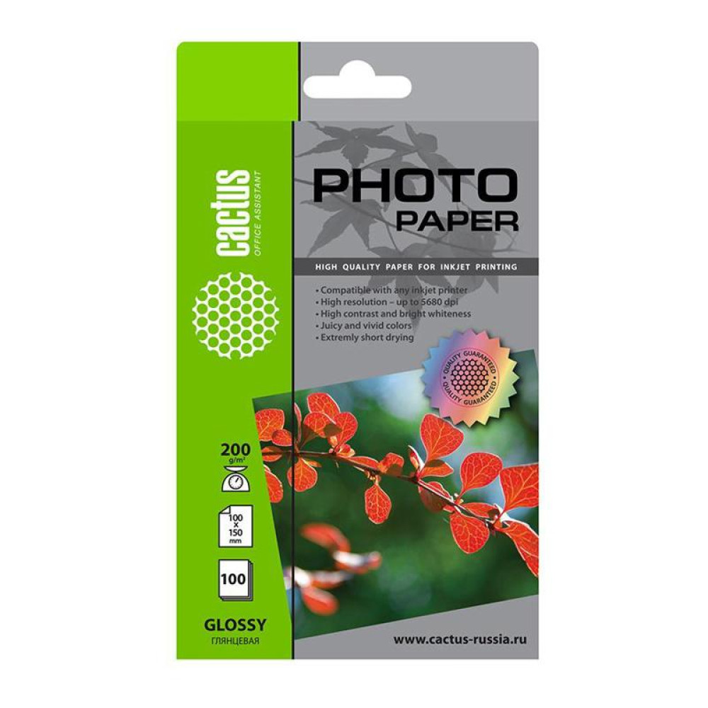 Фотобумага Cactus CS-GA6200100 10x15/200г/м2/100л./белый глянцевое для струйной печати