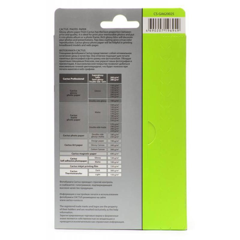 Фотобумага Cactus CS-GA620025 10x15/200г/м2/25л./белый глянцевое для струйной печати