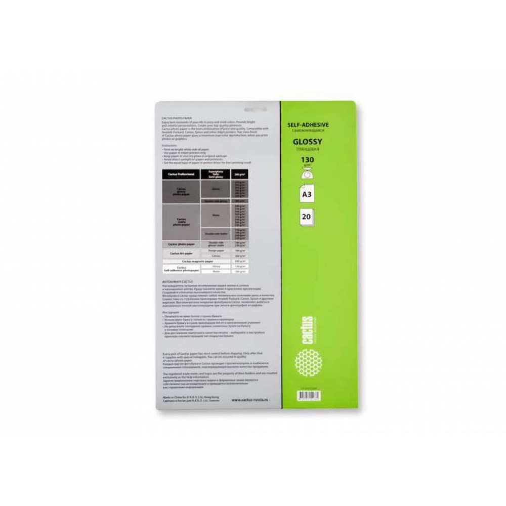 Фотобумага Cactus CS-GSA313020 A3/130г/м2/20л./белый глянцевое самоклей. для струйной печати