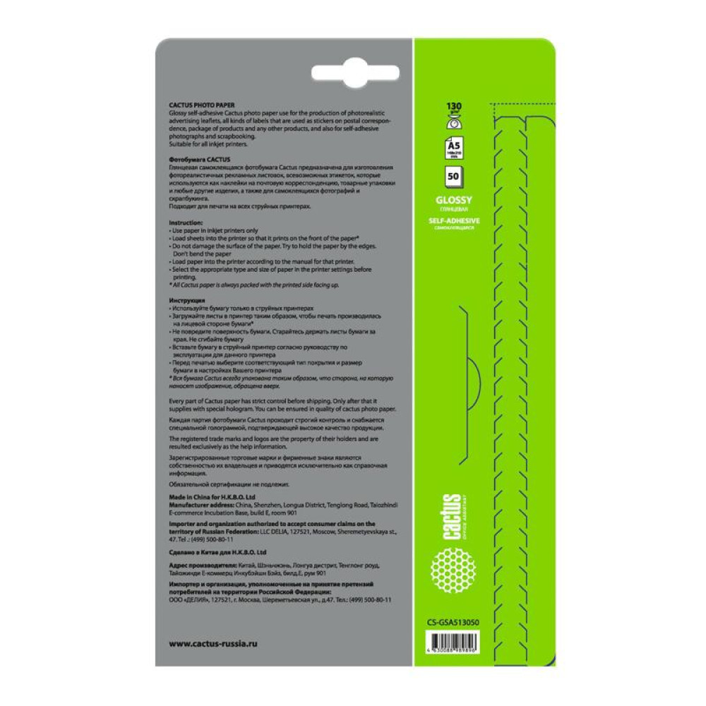 Фотобумага Cactus CS-GSA513050 A5/130г/м2/50л. глянцевое самоклей. для струйной печати