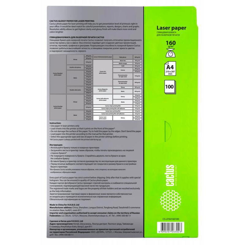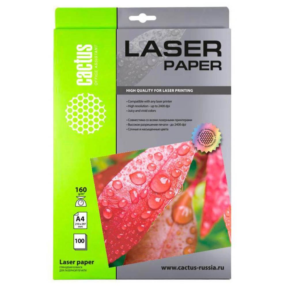 Фотобумага Cactus CS-LPA4160100 A4/160г/м2/100л./белый глянцевое для лазерной печати