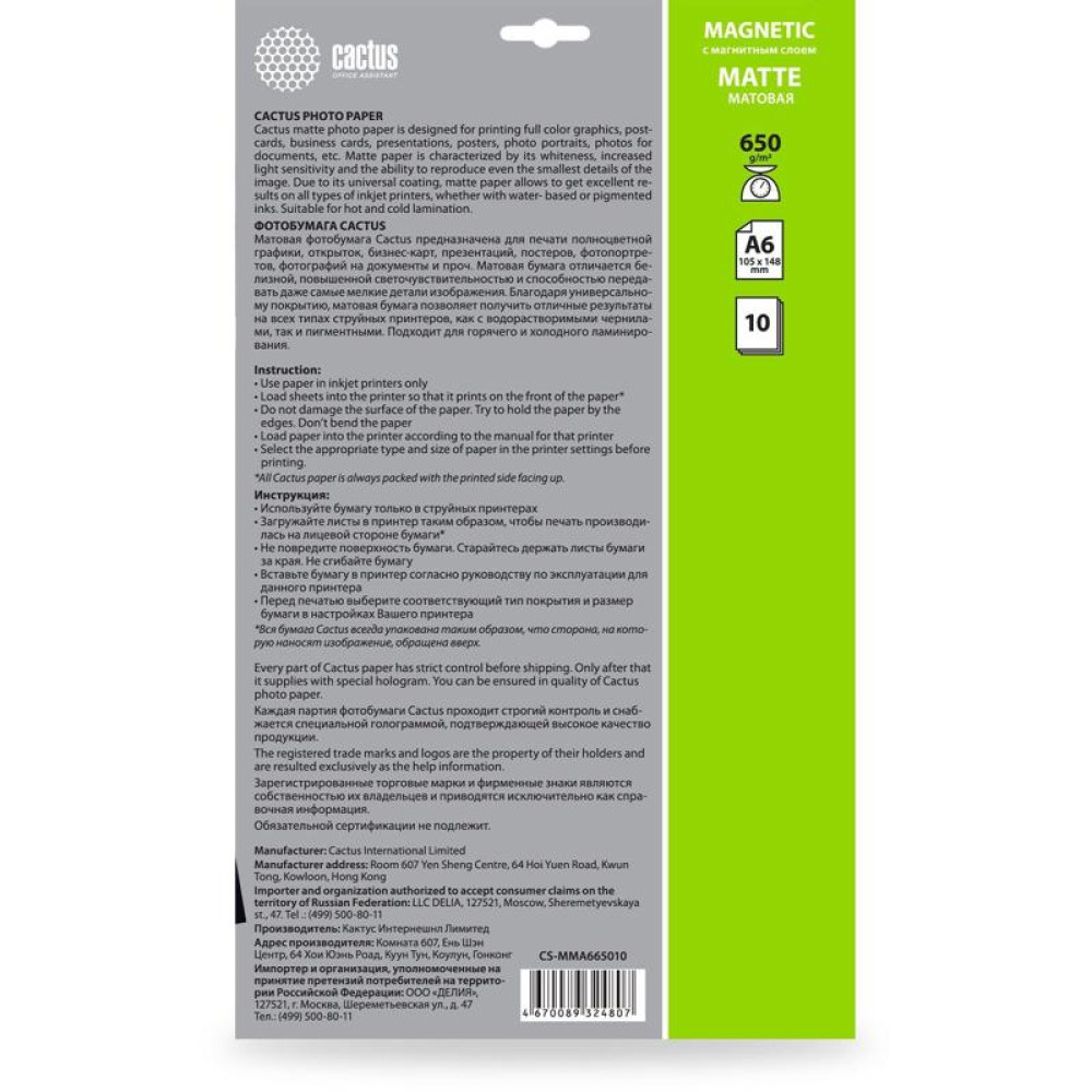 Фотобумага Cactus CS-MMA665010 A6/650г/м2/10л./белый матовое/магнитный слой для струйной печати