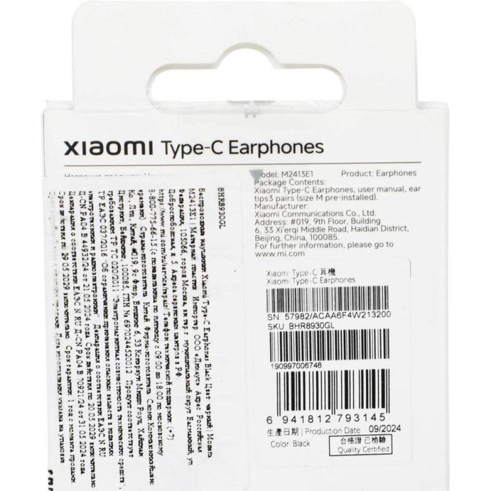 Гарнитура внутриканальные Xiaomi Type-C Earphones 1.25м черный проводные крепление за ухом (BHR8930GL)