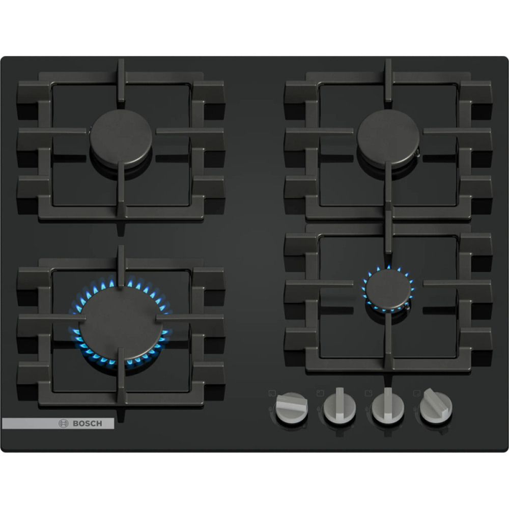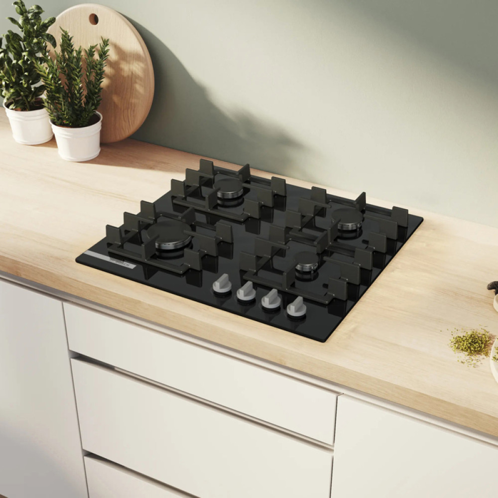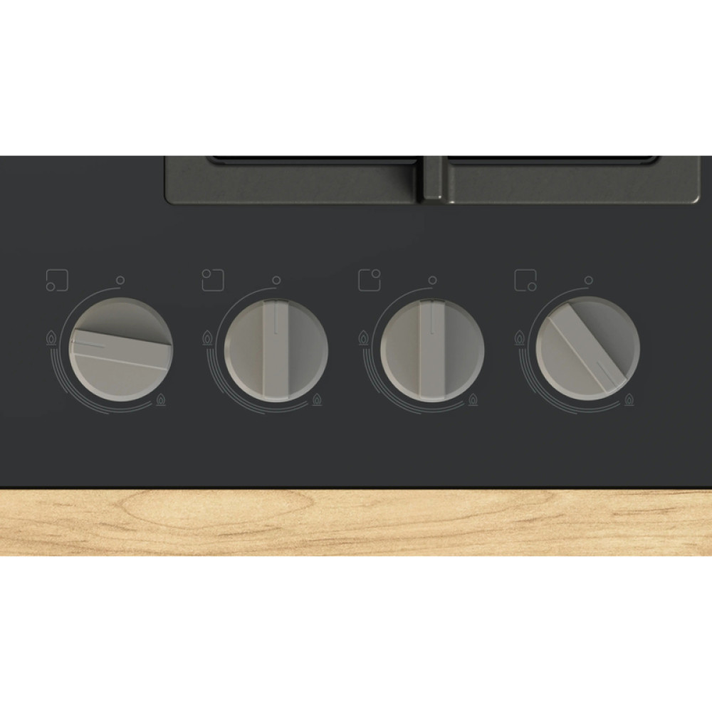 • Газ, 4.5х59x52 см, закаленное стекло, 4 конфорки, газ-контроль, автоподжиг, черный цвет