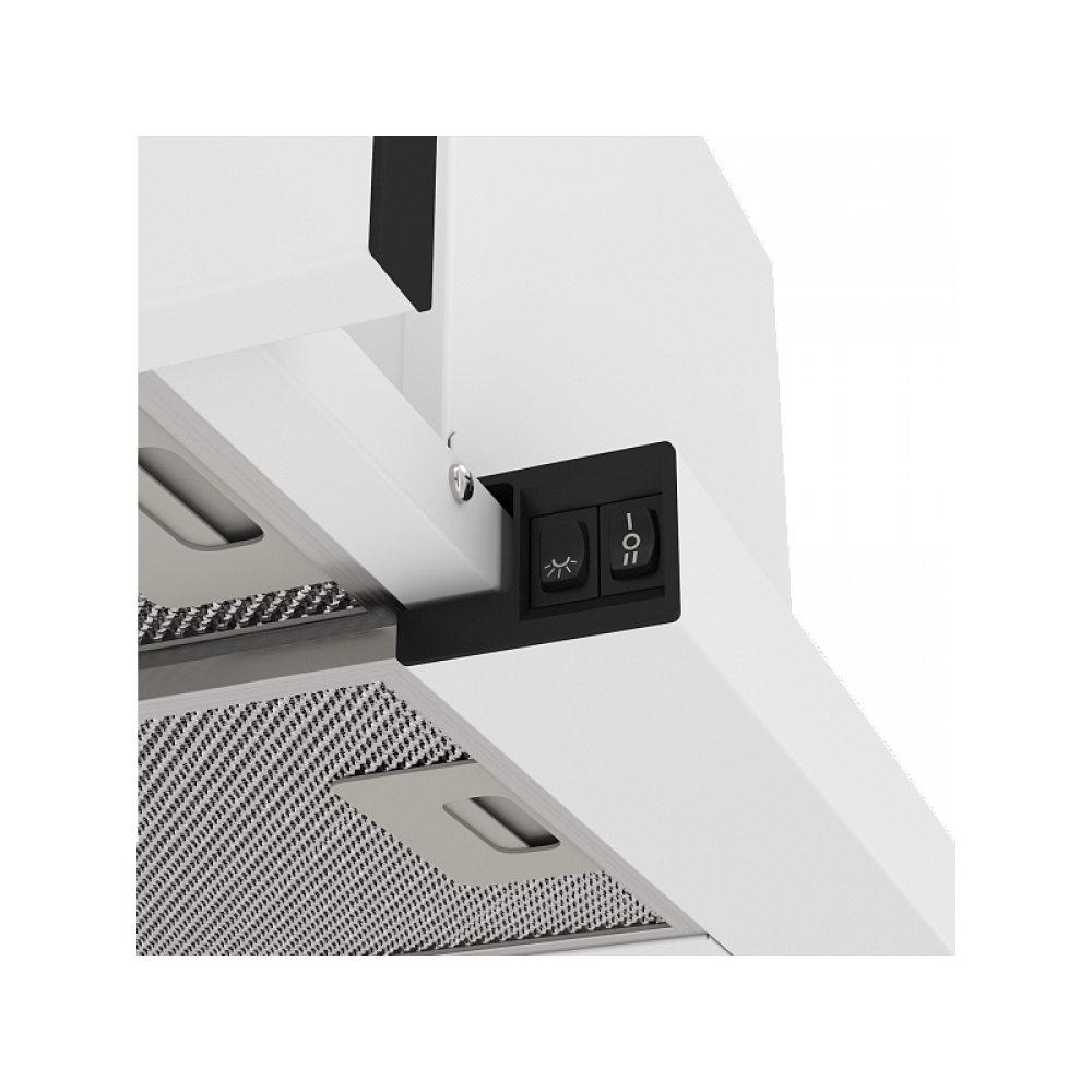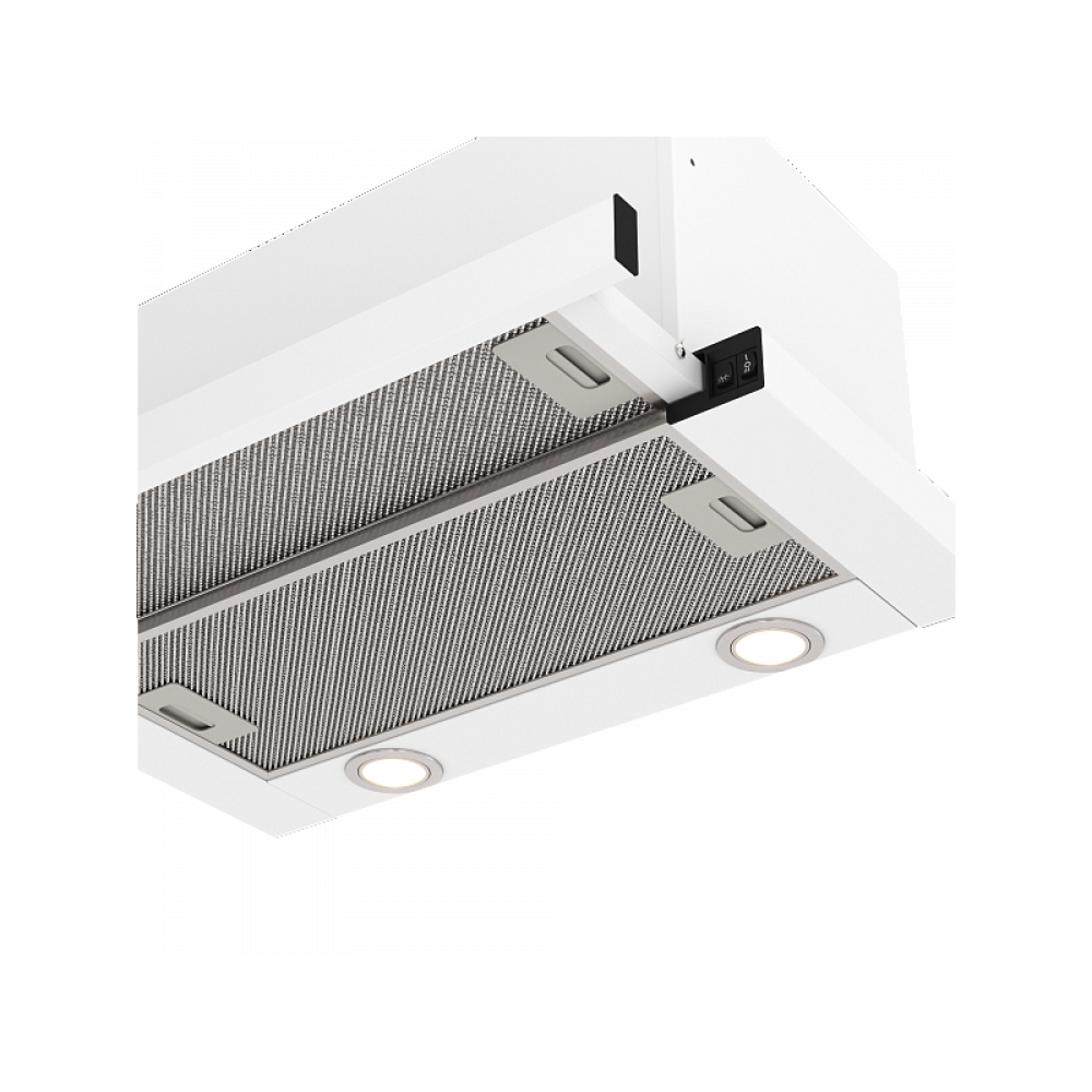 Модель встраивается в кухонный шкаф с выдвижной телескопической панелью. Размеры: ширина — 60 см, глубина — 28 см, высота — 18 см. Диаметр воздуховода — 15 см. Выдвижная панель увеличивает рабочую зону и повышает эффективность захвата паров.