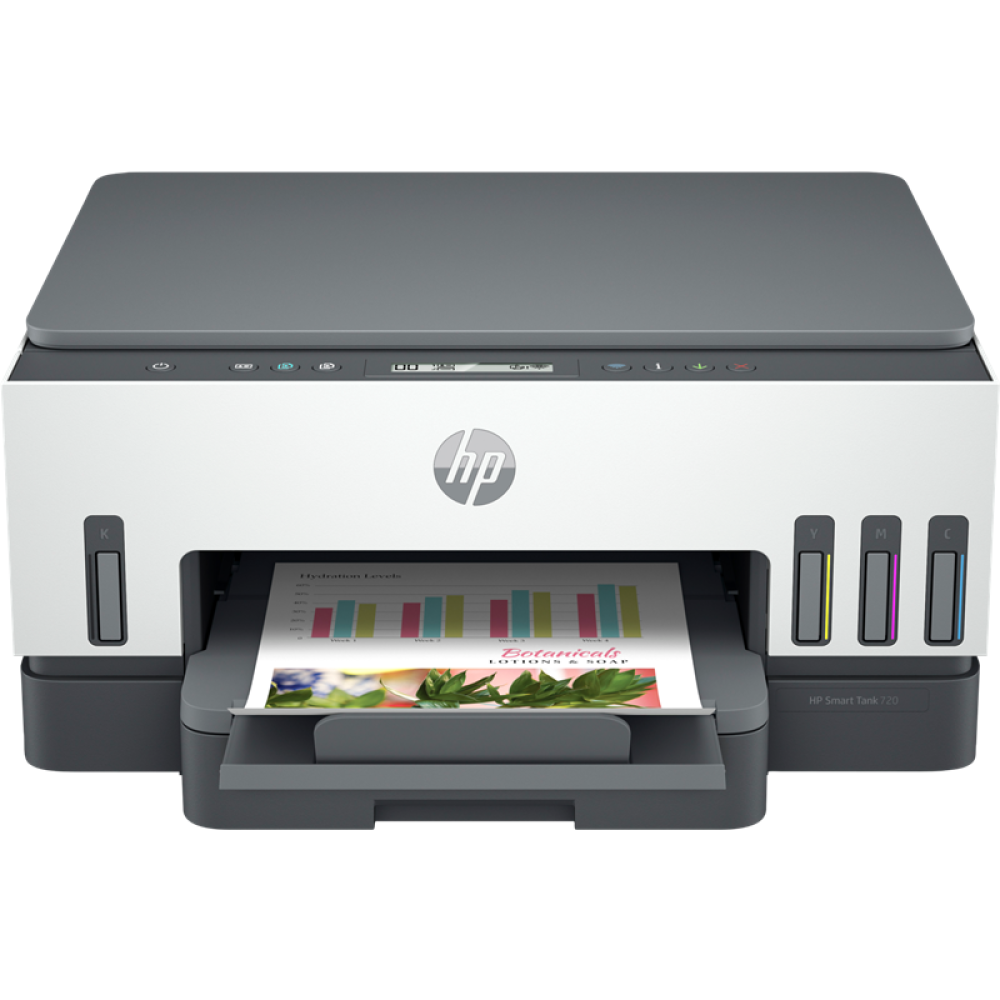 МФУ HP Smart Tank 720 – компактное устройство, которое воплощает в себе функции принтера, сканера и копировального аппарата. В нем реализована термоструйная технология с применением непрерывной подачи чернил, что обеспечивает создание четких и насыщенных отпечатков на различных видах бумаги. Планшетный сканер предусматривает сканирование в электронную почту и на ПК, а копировальный аппарат отличается копированием до 13 страниц за минуту.