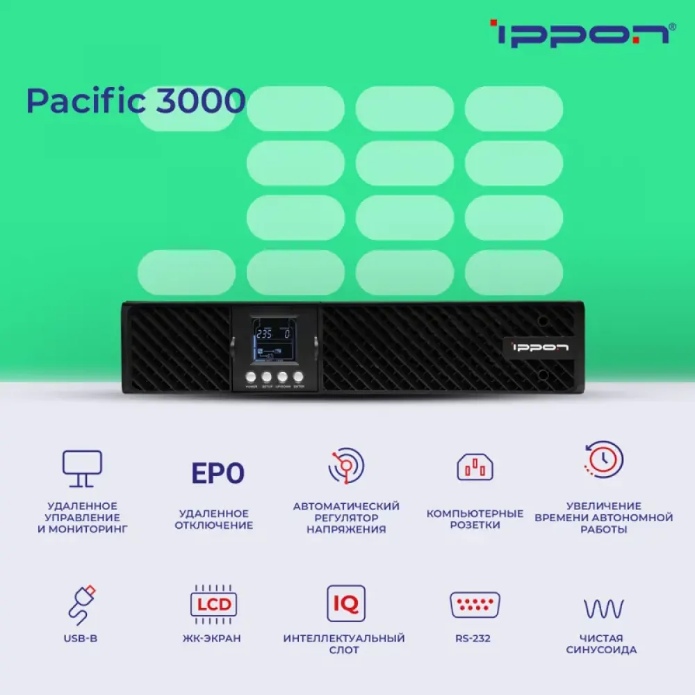 ИБП Ippon Pacific 3000 поддерживает чистую синусоиду, что делает его совместимым с чувствительным оборудованием. Он оснащён автоматическим стабилизатором напряжения (AVR) и защищает технику от перегрузок, коротких замыканий и скачков напряжения.Возможность горизонтальной или вертикальной установки (формат rack/tower) делает модель универсальной в использовании. Также предусмотрен слот расширения для SNMP-карт.