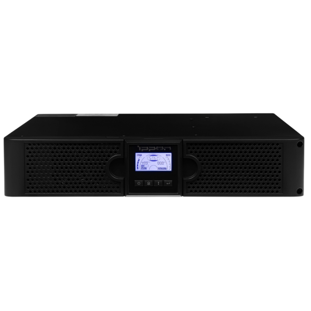 Передняя панель оснащена поворотным ЖК-дисплеем и кнопками, которые позволяют удобно просматривать информацию: уровень нагрузки, напряжения входа/выхода, состояние батарей. Есть возможность отключения звуковых оповещений и запуска самодиагностики. Поддерживается дистанционный контроль через интерфейсы USB, RS-232, есть сухие контакты и EPO.