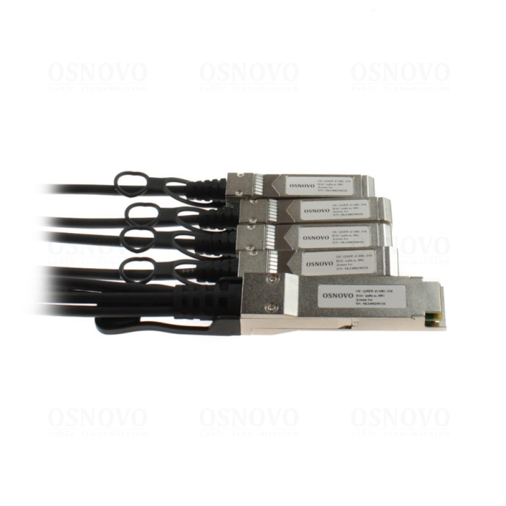 Кабель/ OSNOVO Объединительный DAC кабель QSFP+ 40G для 4х10G. Скорость: 40 Гбит/c. Тип разъема: QSFP+/SFP+. Длина кабеля 1м. Размеры коннектора (ШхВхГ): 11x9x101мм.
