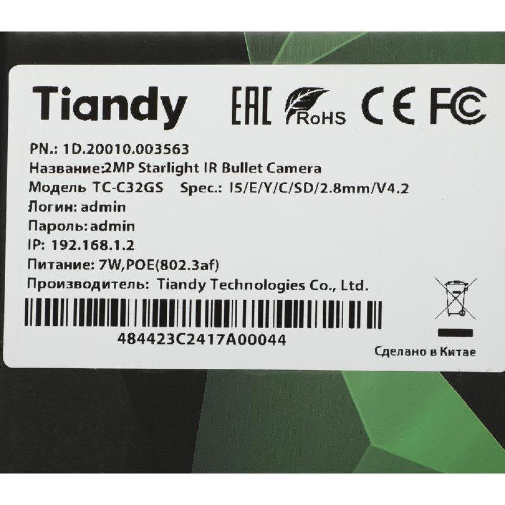 Камера видеонаблюдения IP Tiandy TC-C32GS I5/E/Y/C/SD/2.8mm/V4.2 2.8-2.8мм цв. корп.:белый (TC-C32GS I5/E/Y/C/SD/2.8/V4.2)