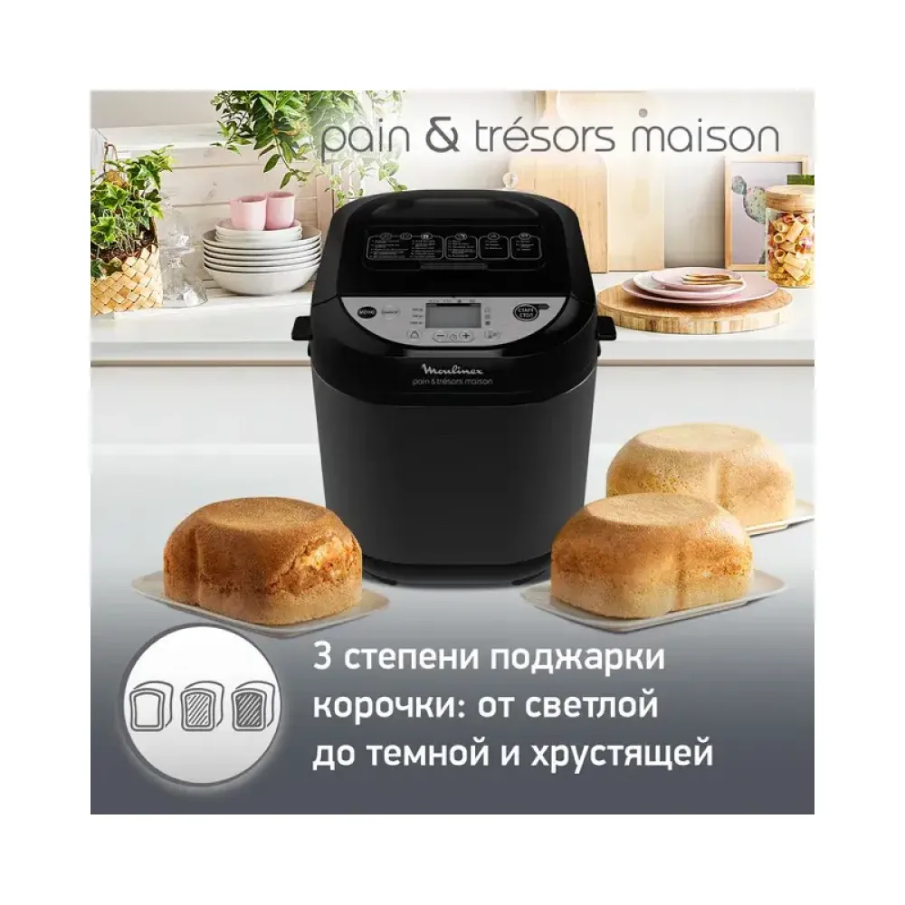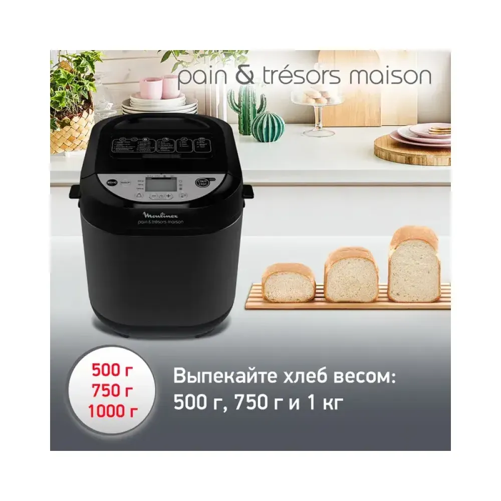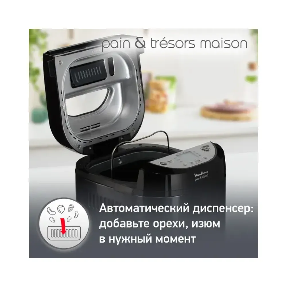 Хлебопечка Pain Trsors от Tefal — это многофункциональное устройство, которое позволяет готовить разнообразные блюда. Благодаря умному объёмному диспенсеру, который автоматически добавляет в тесто изюм, орехи или шоколадную крошку в нужный момент, вы сможете насладиться свежим и вкусным домашним хлебом с необычным вкусом.