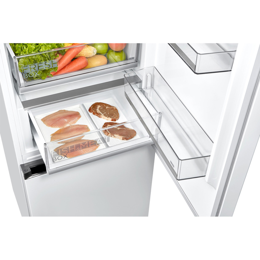 Внутренняя организация холодильника тщательно продумана. Полезный объем составляет 346 л, из которых 223 л отведено под холодильную камеру с тремя стеклянными полками и двумя ящиками, а 123 л — под нижнюю морозильную камеру. Ключевой особенностью является наличие двух зон свежести для специализированного хранения продуктов, а выдвижные полки Easy Get обеспечивают легкий доступ к содержимому.