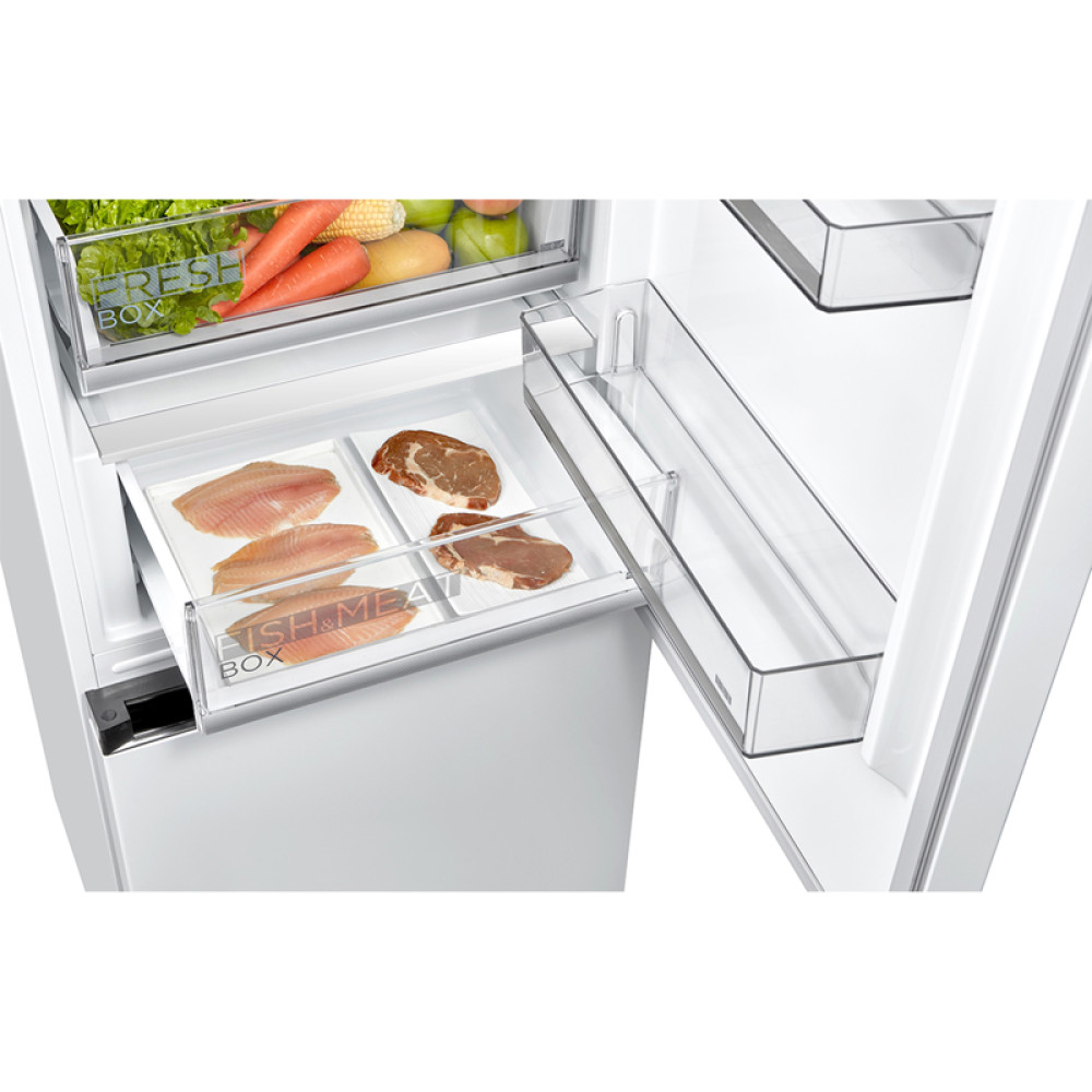 Полезный объем холодильника составляет 386 л, из которых 263 л отведено под холодильную камеру, а 123 л — под морозильник, расположенный внизу. Внутреннее пространство верхнего отсека организовано с максимальным удобством: прочные полки из закаленного стекла легко выдвигаются, а наличие специальной зоны свежести подходит для длительного хранения овощей, фруктов и зелени. Морозильная камера оборудована тремя вместительными ящиками, а на дверце холодильного отделения найдется место для бутылок и небольших продуктов.