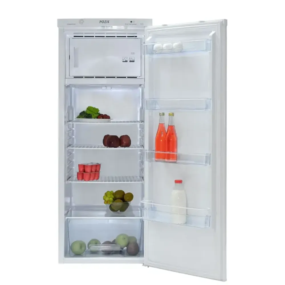 Однокамерный холодильник Позис выполнен в классическом белом цвете. Он оснащен всем необходимым для комфортно использования: прочными полками-решетками, перенавешиваемыми дверями, контейнером для овощей и глубокими дверными полочками для хозяйственных мелочей.Общие данные:Размеры: