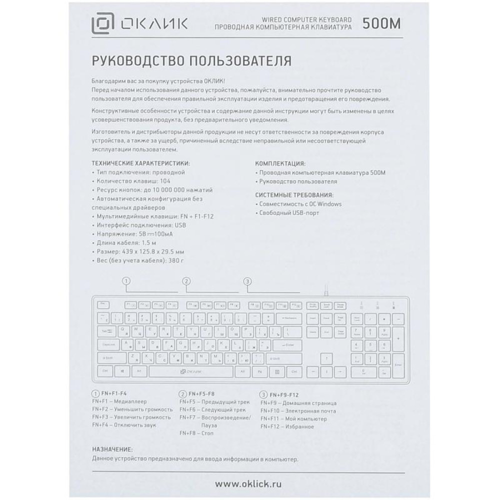 Клавиатура Oklick 500M белый USB slim Multimedia