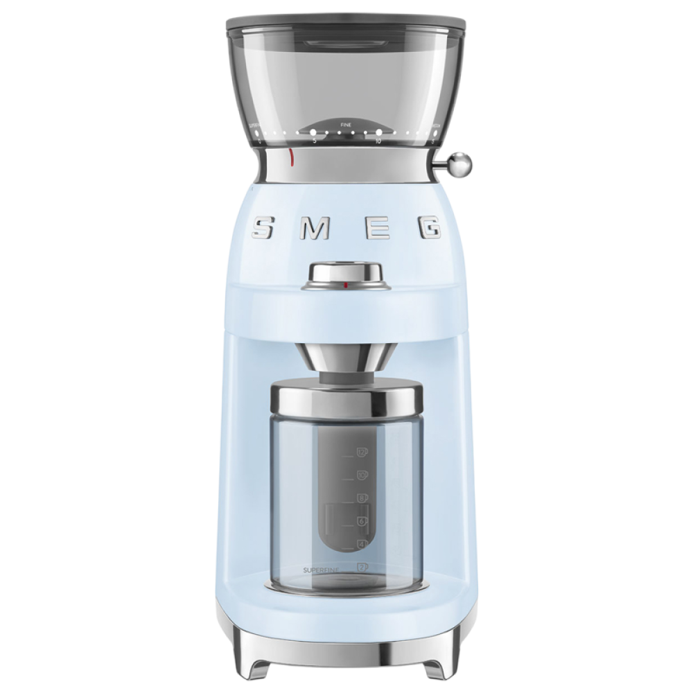 Кофемолка SMEG, стиль 50-х г.г., 15 уровней помола, конические жернова, объем контейнера для кофе 240 г, цвет пастельный голубой