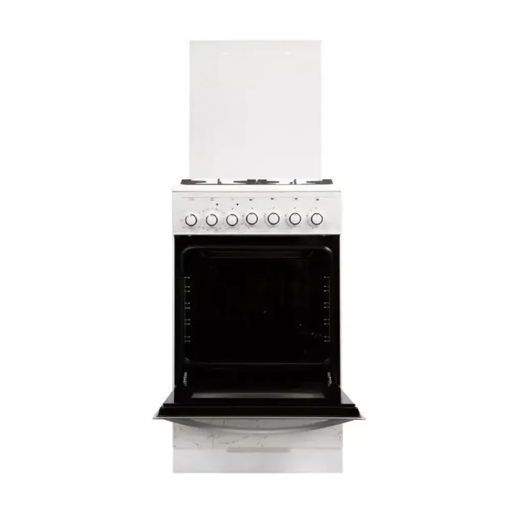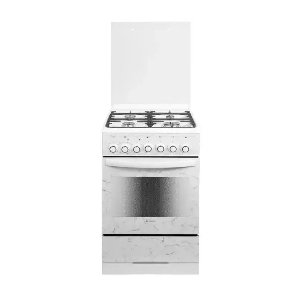 Плита газоэлектрическая. Цвет Белый, фасад с рисунком мрамор белый, крышка стеклянная/ Габариты (ШхГхВ) 50х58.5х85 см. Таймер электромеханический, газ-контроль горелок стола, электророзжиг горелок стола, духовка электрическая, электрогриль, конвекция, вертел с электроприводом, подсветка духовки, съёмные проволочные направляющие, крышка плиты, выдвижной ящик, ножки регулировочные. Полезный объем духовки - 55 литров.